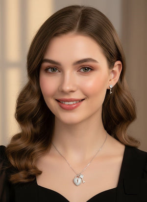 Symbolize love, trust, and connection with this elegant Heart Lock & Key Jewelry Set. Featuring a sparkling heart-shaped lock pendant paired with a delicate key charm, this set includes matching heart key stud earrings. Adorned with shimmering cubic zirconia stones, it’s the perfect romantic accessory for everyday wear or gifting someone special.